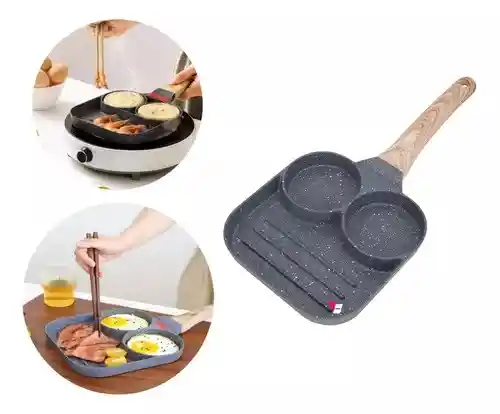 Sartén de 3 compartimientos (Una mini parrilla + dos agujeros) Sartén para preparar Huevos, Tortillas, Arepas, Pancakes, salchichas, tocineta, carne, pollo y mucho mas!!! Este sartén esta construido con un revestimiento de piedra, mango de baquelita (textura de grano de madera) cuenta con aislamiento térmico, agarre cómodo y anti-quemaduras. Este sartén cuenta con un control de temperatura inteligente y materiales premium, que se caracteriza por la lograr conducir de manera uniforme el calor, es práctico para la mayoría de las estufas. El revestimiento cerámico es fácil de limpiar, freír es más fácil y saludable, mientras que lavar es menos complicado. TE ENTREGAMOS: 1- Sartén 3 en 1