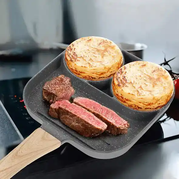 Sartén antiadherente para huevos , Sartén antiadherente 3 en 1 con parrilla dividida, mango resistente al calor. Sartén para preparar Huevos, Tortillas, Arepas, Pancakes, salchichas, tocineta, carne, pollo y mucho mas!!! Este sartén esta construido con un revestimiento de piedra, mango de baquelita (textura de grano de madera) cuenta con aislamiento térmico, agarre cómodo y anti-quemaduras. Este sartén cuenta con materiales premium, que se caracteriza por la lograr conducir de manera uniforme el calor, es práctico para la mayoría de las estufas. Usos múltiples: Este sartén es muy practico para preparar Huevos, Tortillas, Arepas, Pancakes, Hamburguesas entre otros, cuenta con 3 compartimentos para que cocinar sea rápido y fácil. El revestimiento cerámico es fácil de limpiar, freír es más fácil y saludable, mientras que lavar es menos complicado. Diseño multi seccional: la sartén seccional te permite cocinar 3 alimentos diferentes simultáneamente sin mezclarlos. No tienes que freír la comida una vez y limpiar la sartén, lo que te ahorra mucho tiempo y energía al hacer una comida completa. Antiadherente y fácil de limpiar: la sartén dividida está recubierta por un revestimiento de piedra de grado médico antiadherente de alto rendimiento que es inofensivo y muy fácil de limpiar con agua después de cocinar. Con 100 % libre de PFOS y PFOA, nuestra sartén asegura que tu cocción diaria sea siempre más segura y saludable.