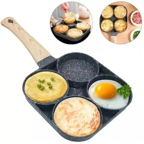 Sartén para preparar Huevos, Tortillas, Arepas, Pancakes, salchichas, tocineta, carne, pollo y mucho mas!!! Este sartén esta construido con un revestimiento de piedra, mango de baquelita (textura de grano de madera) cuenta con aislamiento térmico, agarre cómodo y anti-quemaduras. Este sartén cuenta con materiales premium, que se caracteriza por la lograr conducir de manera uniforme el calor, es práctico para la mayoría de las estufas. Usos múltiples: Este sartén es muy practico para preparar Huevos, Tortillas, Arepas, Pancakes, Hamburguesas entre otros, cuenta con 4 compartimentos para que cocinar sea rápido y fácil .El revestimiento cerámico es fácil de limpiar, freír es más fácil y saludable, mientras que lavar es menos complicado.