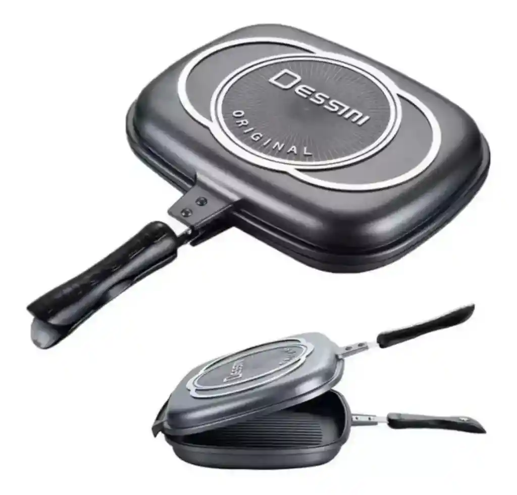 Cocina de manera eficiente y versátil con la sartén doble parrilla antiadherente Dessini, ideal para asar, freír y sellar carnes jugosas o verduras al punto perfecto. Fabricada en aluminio fundido a presión con un recubrimiento antiadherente de alta calidad, evita que los alimentos se peguen y permite cocinar sin necesidad de aceite. Su diseño de doble cara con cierre magnético asegura una cocción uniforme, mientras que sus superficies plana y estriada distribuyen el calor de manera homogénea. Compatible con estufas de gas, halógenas, eléctricas y cerámicas, es una herramienta imprescindible para cualquier cocina. Ficha Técnica: Dimensiones: 36 cm x 36 cm x 8 cm Material: Fabricada con aluminio fundido a presión y con un revestimiento antiadherente de cerámica y mármol Uso: Cocina ** _Para defectos de fábrica o retractos: \_Por favor revise el producto apenas lo reciba y antes de usarlo. No aplican ley de retracto o defectos de fábrica luego de usar el producto. Se manejan máximo 5 días para reportar defectos de fábrica (por ejemplo, producto funciona mal, piezas faltantes, rotas, etc). Para hacer efectiva la devolución el producto debe devolverse con el empaque original, el cual debe estar en buen estado, incluir todos los documentos y las partes completas y sin daños.