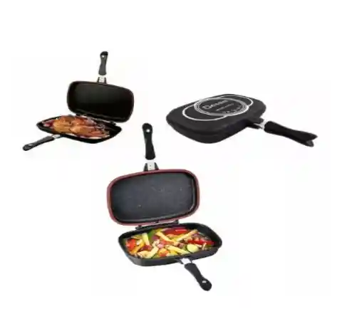 El Sarten doble parrilla Dessini está hecho de aluminio fundido a presión de alta calidad con revestimiento antiadherente, por lo que no tiene que preocuparse por residuos de su carne pegados a la sartén. Durable y fácil de mantener, también puede utilizarse en diferentes estufas, como halógenas, eléctricas, cerámicas, o su gama de gas tradicional. Versátil y eficiente, esta herramienta de cocina es un verdadero activo para su hogar. Revestimiento antiadherente de cerámica y mármol de alta calidad para un rendimiento duradero. Dos superficies: una plana y otra rizada. ESPECIFICACIONES - 32cm -Superficie antiadherente en ambas caras. -Cocina por ambos lados. -Prepara comida sana sin aceite. -Utilízalo para sofreír, saltear, asar, flamear. -Cierre magnético.