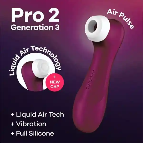 Tu clítoris se inundará de placer como nunca antes: ¡Ya está aquí el Satisfyer Pro 2 Generación 3! Con nuestra innovadora tecnología Liquid Air, la última generación de este clásico Satisfyer imita la oleada sensual del agua pulsante. • La tecnología Liquid Air imita la oleada sensual del agua en movimiento. • Estimula el clítoris mediante intensas ondas de presión sin contacto directo. • Fabricado con silicona de grado médico súper suave, agradable para la piel, suave al tacto y extremadamente higiénica. Satisfyer Pro 2 Generación 3: Surfea tu camino hacia orgasmos inimitables. El Satisfyer Pro 2 Generation 3 es el dispositivo de bienestar sexual definitivo cuando se trata de estimulación del clítoris. El sucesor del popular Satisfyer Pro 2 es mucho más que un clásico vibrador de ondas de presión con tecnología Air Pulse. Disfruta de 12 programas de vibración con sus dos motores. Sin embargo, la impresionante revolución es nuestra innovadora tecnología Liquid Air: el capuchón adicional, con su fina y supersuave membrana de silicona, crea intensas ondas que imitan la sensual oleada del agua pulsante. El Pro 2 Generation 3 inunda tu cuerpo con estas ondas de placer, creando una sensación particularmente natural y permitiendo orgasmos nítidos como nunca antes habías experimentado. ¿Prefieres provocar tu clítoris con la familiar tecnología Air Pulse y completamente sin contacto? El Pro 2 Generation 3 viene con dos accesorios para que tengas las dos opciones. Sumérgete en 11 programas de ondas de presión, que puedes usar sin más o combinar con 5 velocidades de vibración y 7 patrones de vibración. ¿Cuáles son otros beneficios del Satisfyer Pro 2 Generation 3? El Satisfyer Pro 2 Generation 3 tiene un diseño mate refinado. A diferencia de su predecesor, este innovador vibrador Satisfyer Air Pulse está fabricado con silicona 100 % sin junturas, respetuosa con la piel y con tacto Soft Touch Feel (supersuave sobre la piel y especialmente higiénico). Su acabado resistente al agua (IPX7) permite que te lo lleves a la ducha o la bañera y también facilita su limpieza con agua tibia y jabón suave. Después de alcanzar clímax alucinantes, puedes recargar fácilmente las baterías integradas del vibrador con el cable de carga USB incluido. Características: • Estimulación del clítoris mediante ondas de presión sin contacto directo con tecnología Air Pulse y Liquid Air. • Material: Silicona grado médico + ABS. • Incluye 2 Boquillas de Silicona médica intercambiables (1 Air Pulse - 1 Liquid Air) • 11 programas de ondas de presión. • 12 programas de vibración. • Motores súper potentes. • Diseño ergonómico para facilitar su uso. • Modo susurro (Es silencioso). • Batería de Iones de Litio. • Cable USB de carga magnética incluido. • Fácil de limpiar. • Waterproof IPX7: Resistente al agua, se puede sumergir hasta 1 metro de profundidad por no más de 30 minutos (En Lugamia recomendamos no sumergirlo ya que un mal uso al momento de hacerlo, puede dañar el juguete). • Color: Vinotinto. • Con App: No. Medidas: • Largo: 16,4 cm • Ancho: 6,5 cm • Alto: 4,6 cm • Peso: 203 g. Recomendaciones de Uso: Para una experiencia más placentera, es ideal que el uso de este juguete sea con lubricantes a base de agua. Recomendamos el Gel Lubricante Íntimo Natural Elixir. No se deben usar lubricantes de silicona con juguetes de silicona. Podrían sufrir daños irreversibles. Limpieza: Antes de usar el juguete por primera vez, y después de cada uso, este debe ser limpiado para reducir el riesgo de infecciones, mantener la higiene adecuada y evitar el deterioro rápido del juguete. Recomendamos un producto especial para limpieza óptima como los Limpiadores para Juguetes Elixir que podrás encontrar en Lugamia Sex Shop. Confidencialidad: Tus pedidos se envían en una caja o sobre totalmente sellado opaco sin ningún tipo de marcas externas. Para nosotros es muy importante tu privacidad.