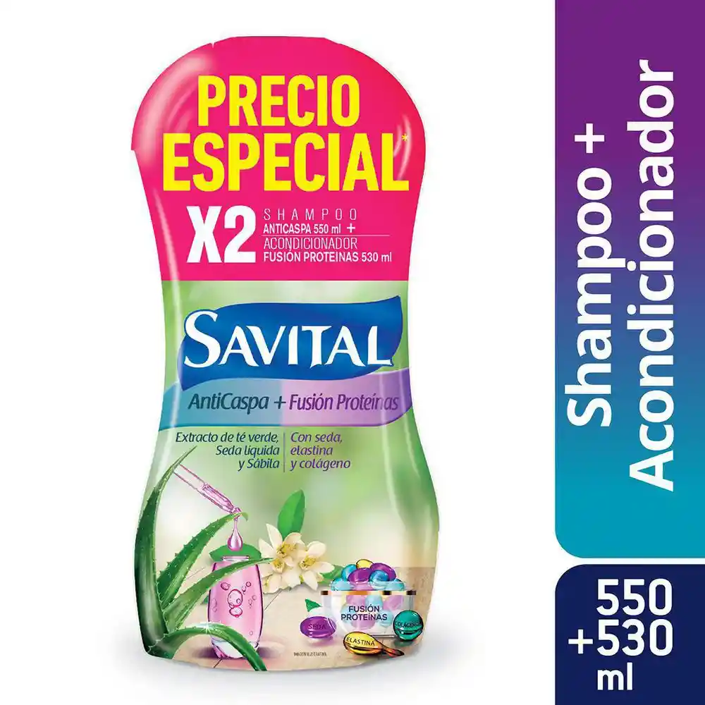 Champú y acondicionador con proteínas de origen natural, como la seda, la elastina y el colágeno, las cuales se unen al poder de la sábila en una fórmula única que recubre y refuerza cada fibra capilar, haciéndolas más resistentes, dándoles una fuerza extraordinaria y dejando tu pelo más brillante y hermoso. El pack contiene 1 champú anticaspa de 550 mL y 1 acondicionador de 530 mL.