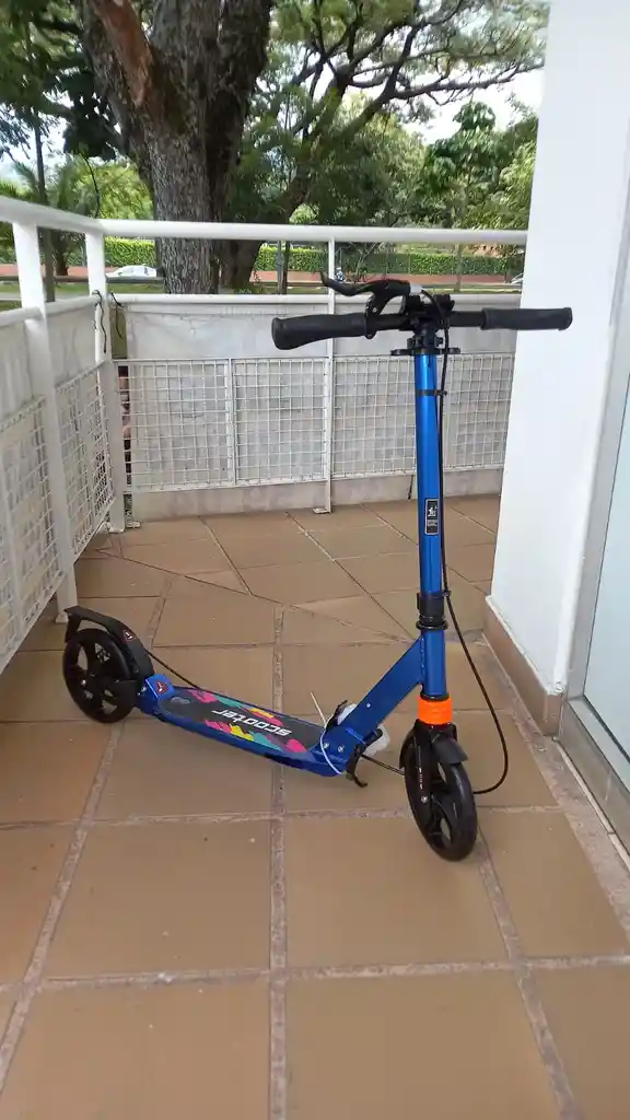 El scooter de rueda grande tiene una suspensión cómoda y está hecho de aluminio puro y es robusto, elegante y fácil de transportar. no es electrica Características: •Plegable • Barra t de aluminio con mango de goma •200x30mm • Rueda de fundición • Doble sistema de absorción de choque . Freno de disco y freno de mango • Rodamiento de acero al carbono • abec-7 de alta calidad •Tamaño del producto : 94*36.5*106cm. altura máxima producto: 106 cm • Tamaño de la cubierta : 455*135mm • Mecánica de impulso