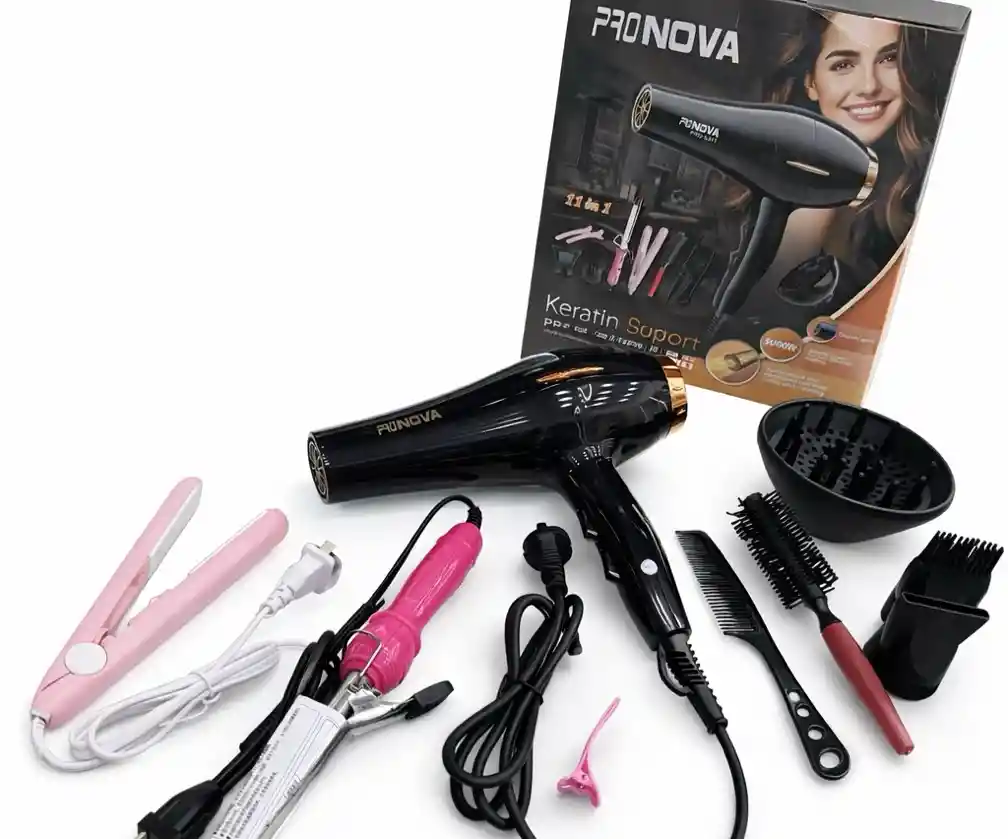 Transforma tu rutina de belleza con el PRO NOVA PRO-5311, un secador de alto rendimiento diseñado para lograr resultados de salón desde la comodidad de tu hogar. Su potente motor de 5000W ofrece un flujo de aire intenso y constante, reduciendo el tiempo de secado y aportando un acabado brillante, suave y sin frizz. Características principales Potencia profesional de 5000W: Secado rápido, eficiente y duradero. 2 velocidades y 3 niveles de temperatura: Control total para todo tipo de cabello. Función de aire frío: Fija el peinado y mantiene el brillo natural. Diseño ergonómico y liviano: Ideal para uso prolongado sin fatiga. Boquilla concentradora y difusor: Resultados precisos y definición de rizos. Este producto se encargará de cuidar la salud del pelo y de crear el look perfecto para cada ocasión.