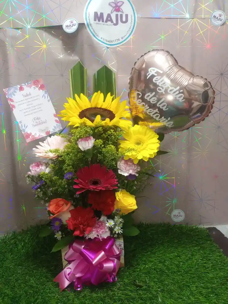 arreglo en base de madera con gerbera rosas y girasol para toda ocasión