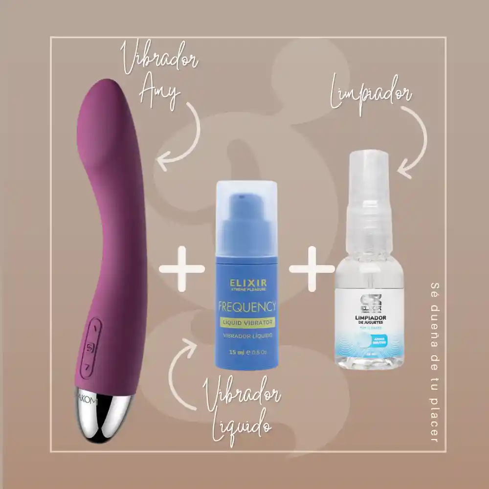 Amy Svakom - Vibrador Punto G: Un juguete elegante, potente y ultra silencioso diseñado para la estimulación precisa del punto G. Fabricado en silicona segura para el cuerpo, 100% impermeable y con 5+1 modos de vibración e intensidades ajustables. Su batería recargable ofrece hasta 2 horas de placer continuo. Frequency Vibrador Líquido: La combinación perfecta para intensificar cada sensación. Su fórmula con Spilanthes Acmella y mentol despierta los sentidos con un efecto vibrante y refrescante. Elixir - Limpiador de Juguetes Neutro: Mantén tus juguetes impecables con esta fórmula sin alcohol ni parabenos, diseñada para cuidar la silicona y otros materiales delicados. Un regalo ideal para consentirte, explorar y mantener tu placer en su mejor estado.