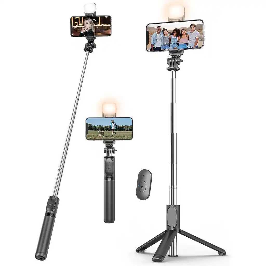 Palo selfie extensible: Ajusta la longitud del palo para capturar selfies y fotos de grupo perfectas. Trípode integrado: Convierte el palo selfie en un trípode estable para fotos y videos con mayor nitidez. Luz LED de 3 intensidades: Ilumina tu rostro de forma natural y uniforme en cualquier situación de luz. Control remoto Bluetooth 5.0: Controla el obturador de tu cámara a distancia sin necesidad de tocar tu teléfono. Multifuncional: Úsalo como palo selfie, trípode o soporte para tu teléfono. Compatible con todos los celulares: Se adapta a una amplia gama de dispositivos iOS y Android. Palo Selfie + trípode teléfono inalámbrico Bluetooth con control remoto incorporado. -Rotación abrazadera 360 para modo horizontal o vertical. -Extensible desde el tamaño bolsillo 18.5 c.m. hasta 68 c.m. completo. -Aleación de aluminio ligero y resistente. -Amplia compatibilidad, se adapta a la mayoría de teléfonos iOS/Android, GoPro, cámaras pequeñas y celulares. -Accesorio sin necesidad de llevar un trípode pesado. -Peso aproximado 110 gramos.
