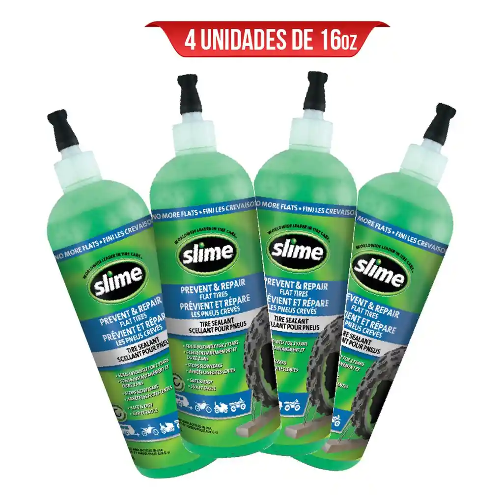 El sellador de llantas Slime busca y sella instantáneamente las ponchaduras en el área de la banda de rodamiento de hasta 6 mm (1/4 pulg.) con tecnología Fibro-Seal. Use el sellador de llantas Slime con una fuente de aire para reparar ponchaduras en automóviles, camiones, motocicletas y camionetas y SUVs. Instale Slime en las llantas de cualquier vehículo todoterreno y evite ponchaduras antes de que ocurran. Los tamaños generales de neumáticos y cámaras y las cantidades de Slime necesarias aparecen en el cuadro anterior y en el material de embalaje IMPORTANTE: Gel preventivo y correctivo para perforaciones hasta de 3mm dentro del labrado de la llanta. Protección hasta por dos años. Por favor seguir las instrucciones que están al respaldo de la etiqueta. Para saber la cantidad exacta de Slime que debe aplicar, por favor ingresar a: https://www.slime.com/la/slime-calculator.php. 4 unidades cada una de 16oz Producto Importado De alta Calidad Larga duración Precio justo