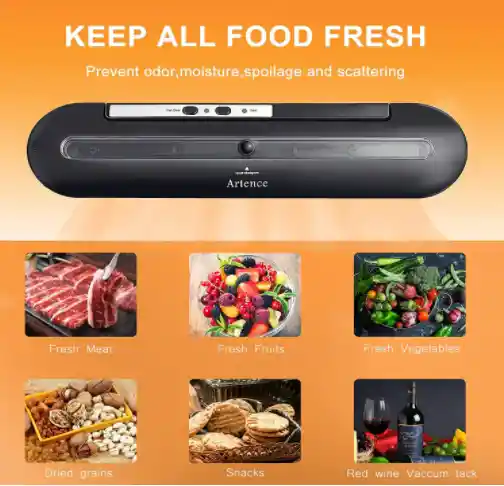 Nuestro sellador de alimentos al vacío está hábilmente diseñado con función de vacío y sellado. Puedes utilizar la máquina selladora de alimentos al vacío para guardar carne, mariscos, frutas, frutos secos, dulces y otros alimentos. Si se trata de alimentos secos o húmedos, puede utilizar nuestra máquina selladora de alimentos al vacío. Se adapta a casi todos los alimentos. Fácil de usar y tiempo de sellado más corto: esta máquina automática de ahorro de alimentos viene con solo 2 botones, es realmente amigable para cualquier usuario. Solo tienes que elegir el modo de sellado de vacío o sellado. Y entonces nuestro sellador de alimentos al vacío te dará una bonita bolsa al vacío en 45 segundos La máquina selladora al vacío Artence integrada con una bomba de aire fuerte de 60 kpa eliminará todo el aire de las bolsas al vacío. Una vez que elijas el sellador de alimentos al vacío significa que tu comida obtendrá 5 veces más tiempo de frescura que otros alimentos. Además, nuestro sellador al vacío para alimentos te permite ser más económico y rápido mientras preparas comidas. No es solo un ahorro de alimentos, sino un ahorro de dinero