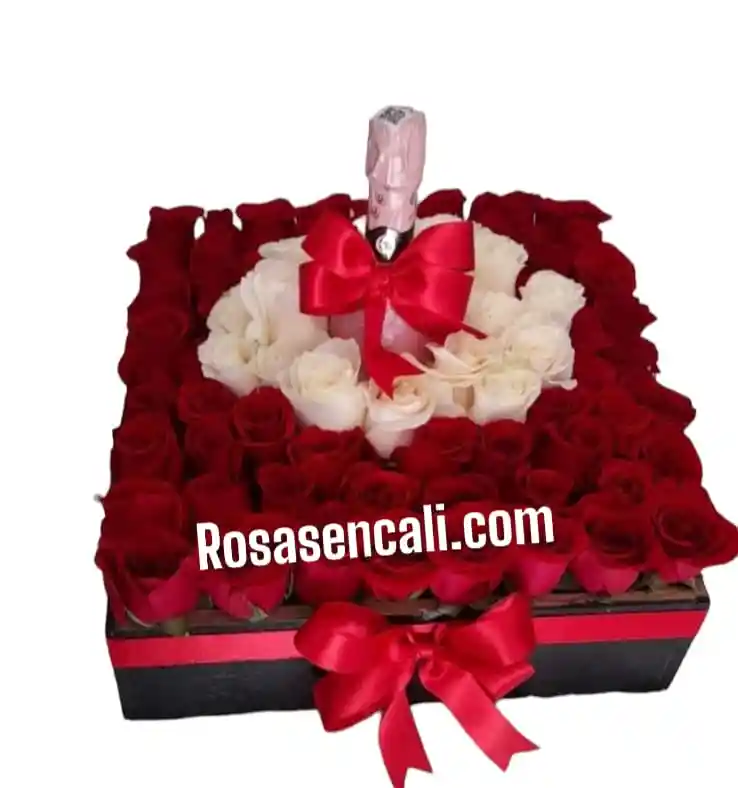 base de madera cuadrada en rosas, botella jp chenel pequeña, moño y tarjeta con mensaje