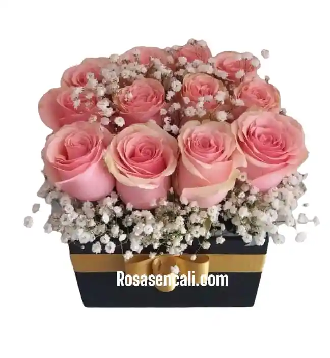 base de madera cuadrada con 12 rosas, fino follaje, moño y tarjeta con mensaje