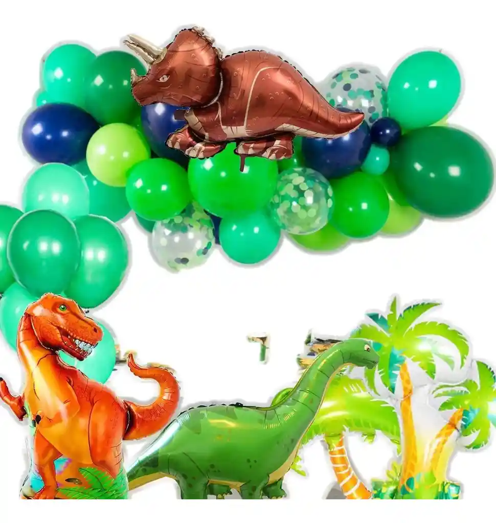 *********************GLOBOS Y PELUCHES MASMELO********************* Por tu compra te llevas. 1 Globo dinosaurio 65x45cm 1 Globo tiranosaurio 65x45cm 1 Globo braquiosaurio 100×50 cm 1 GLobo palmera 65x45cm 20 Globo verde fashion 30cm 10 Globo verde selva 30 cm 10 Globo verde lima 30 cm 3 Globo confetti plateado 30 cm 4 Globo azul naval 30 cm 5 Metros de nylon Los globos se entregan desinflados, tu compra no incluye el montaje ni la decoración, el servicio de armado no lo tenemos disponible. sin embargo te damos todas las instrucciones para hacerlo de modo profesional. Si deseas adicionar otros articulos a tu compra puedes escribirnos, recuerda que Somos Globos y Peluches Masmelo Si necesitas variación en los colores, colocar un número, más globos o realizar otros cambios en el diseño original escribenos para ver si podemos hacerlo. Tenemos todo lo necesario para tus decoraciones, somos lo último en tendencias mundiales decorativas. Tenemos disponible: Vasos, platos, manteles, guirnaldas, cubiertos, globos de todo tipo, números, letreros, vela, Etc. Puedes encontrar los articulos de nuestra tienda en el siguiente link, copia y pega, si no encuentas lo que necesitas escribenos: https://www.rappi.com.co/tiendas/900280040-globosypeluchesmasmelo-mt-enc/decoracion-para-fiestas/globos-y-bombas