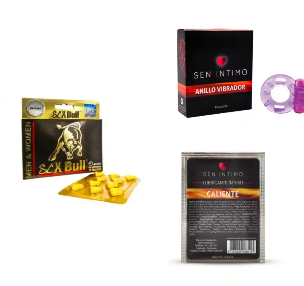 Prolonga la pasión con este kit, incluye lubricante Íntimo caliente 7 ml, potenciador Scx Bull x 5 y anillo Sen Íntimo