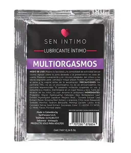LUBRICANTE MULTIORGAMOS ESTIMULANTE - SEN INTIMO CON REGISTRO INVIMA Contiene: Sachet 7ml ¡Activa tu zona de mayor placer! Diseñado para que descubras tus zonas de mayor placer y las estimules. Mejora el flujo sanguíneo en tu zona íntima e incrementa la sensibilidad, llevándote al orgasmo con más facilidad. Modo de uso: Masajea suavemente y en círculos alrededor del clítoris y los labios vaginales para conseguir mayor placer. Puedes aplicarlo sobre el pene y la vagina antes de la penetración. Confidencialidad: Tus pedidos se envían en una caja o sobre totalmente sellado y opaco sin ningún tipo de marcas externas. Para nosotros es muy importante tu privacidad.