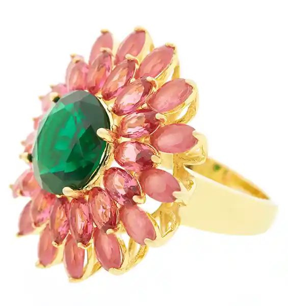 Anillo en Plata Ley 900 y Bronce Con Baño de Oro 24 Kilates e Incrustación de Cristales Rubí y Verde Esmeralda.