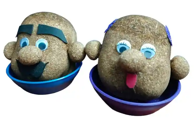 Pareja de señor y señora cara de papa pasto Manualidad de semillas de alpiste, que al rociar agua diariamente ella crecera en su cabeza su cabello verde. Al ser una manualidad varia el diseño del señor y señora cara de pasto. Tamaño: 7cm de largo por 8cm de ancho aproximadamente, incluido recipiente .