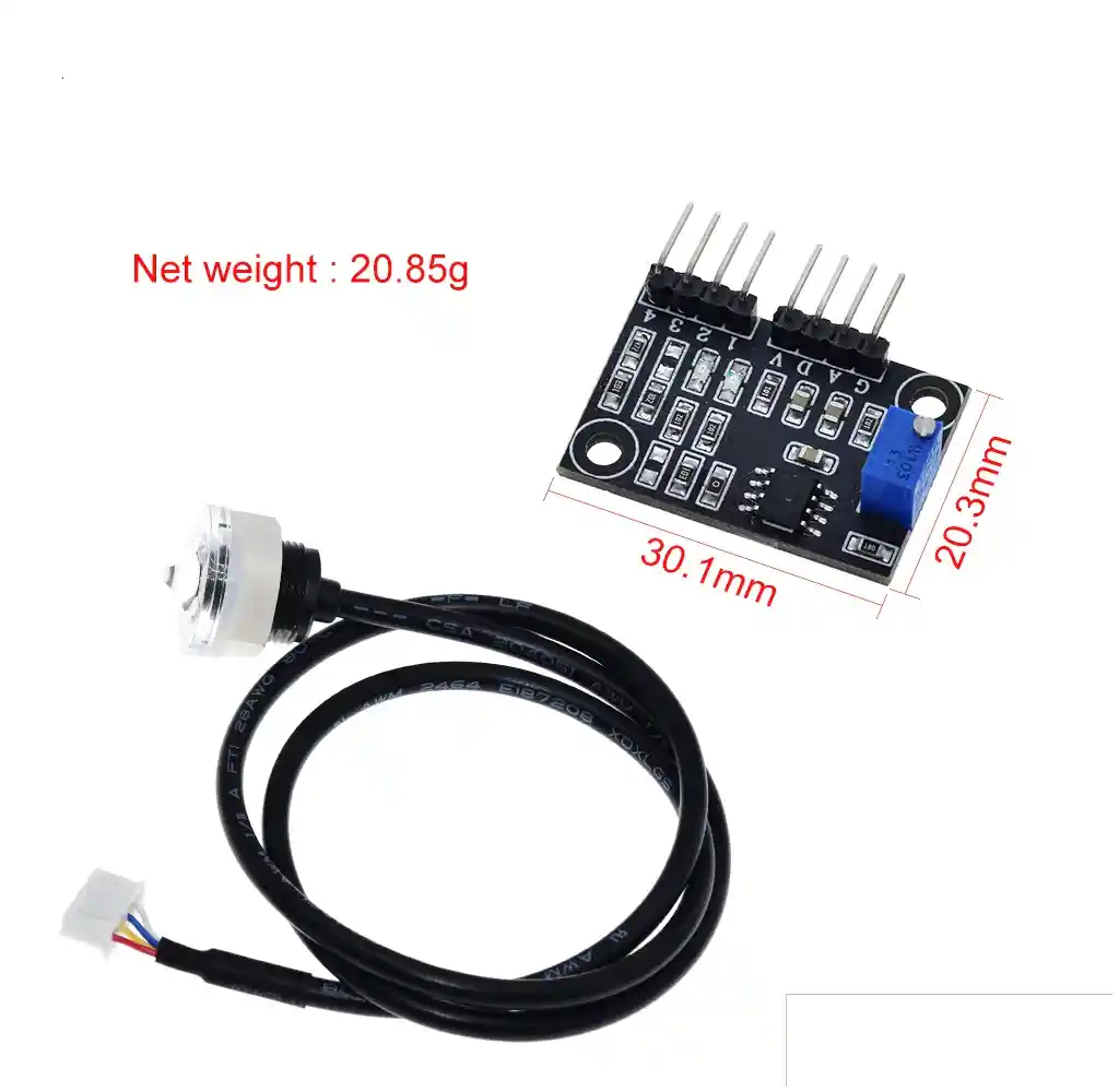 Funcion: para deteccion de nivel y deteccion de alarma en contenedores El modulo de deteccion de nivel de liquido solo se utiliza para la deteccion de nivel y la deteccion de alarma en el contenedor. Aplicable a: dispensadores de agua, purificadores de agua, ventiladores de aire acondicionado, humidificadores, ventiladores de aire frio, vapor y otros productos electricos que requieren control y proteccion del nivel de agua; Voltaje de funcionamiento: DC5V +- 0.25V Corriente de funcionamiento: 16mA metodo de salida: Salida de señal de alto nivel > 4.8V Output salida de señal de bajo nivel < 0.5V Tiempo de respuesta: <500 ms Resistencia de aislamiento: 100Mohm Temperatura de trabajo: 0 ~ 80 C Humedad de funcionamiento: 0-100% HR Metodo de instalacion: agujero redondo M15 * 12 Longitud del cable: 0,5 metros Peso: 30g LA COMPRA INCLUYE: 1X SENSOR NIVEL AGUA OPTICO LGDZ V1.1