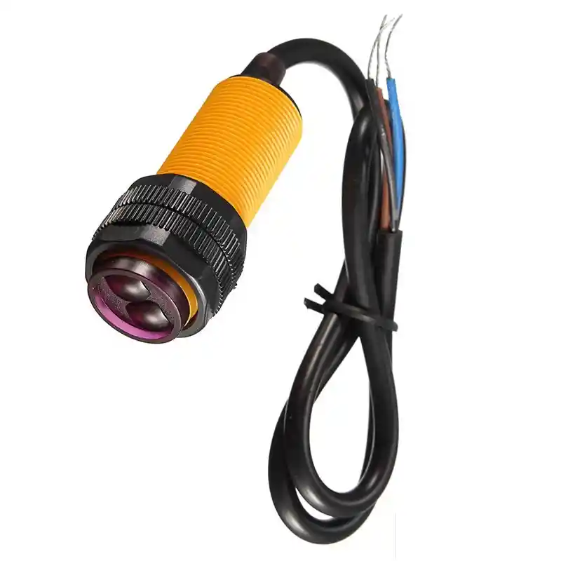 Sensor infrarrojo basado en un emisor y un receptor fotoelectrico (infrarrojo). La distancia de la deteccion se puede ajustar de acuerdo a las necesidades que tenga el usuario y esta puede ser regulada de 3cm a 80cm, es pequeño, facil de usar/ajustar gracias a sus roscas de sujecion las cuales se adaptan facil y rapido a la mayoria de los entornos. Este sensor es muy util para robotica, posicionamiento de brazos, mecanismos, detector de obstaculos / presencia, switch de limite, contador de piezas, medios de interaccion, lineas de ensamblaje industriales, entre otros. Cuenta con un led que permite probar el sensor solo conectandolo a la alimentacion, facilitando las pruebas y montaje. Hay que tener en cuenta que este sensor no dara como medicion de voltaje un nivel de voltaje analogico, sino que dara un nivel logico de 1 o 0 voltios, dependiendo de la sensibilidad ajustada en el potenciometro de la parte trasera del sensor. Cable Cafe: Positivo Cable Azul: Negativo Cable Negro: Señal Modelo E18-D80NK Voltaje de operacion 5V Corriente de operacion 100mA Tamaño : Diametro: 18mm Sensor Longitud: 45mm Longitud del cable: 450mm Tiempo de respuesta <2ms Distancia a sensar 3cm~80cm Temperatura de operacion -25C~55C LA COMPRA INCLUYE: 1x SENSOR PROXIMIDAD INFRAROJO E18-D80NK