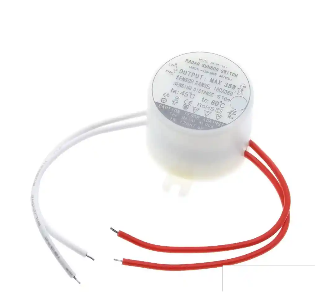 Interruptor de sensor de radar redondo 2.Modelo: AM-RS-10Y 3.Voltaje de funcionamiento: 185V-265V 50 / 60Hz Ajustable 110 4.Potencia de control: 5-35W 5.Distancia de deteccion: 6-8mt 6. Tiempo de retardo: 18-25 segundos +/- 5 segundos 7.Consumo de energia : 0.W 8.Tamaño: D34.5 * H27 redondo 9.angulo de deteccion: 180 * 360 ° redondo 10.Funcion de control de luz: 10LUX (intensidad de luz no mas de 10LUX si hay algun objeto en movimiento, la luz estara encendida; de lo contrario, se considera que es de dia y la luz esta apagada 11.Lamparas de lampara: lampara de techo LED, lampara de luz diurna LED, lampara empotrada LED, etc. : pasillos, planta baja, sotano, almacen, etc. en los que la luz debe estar siempre encendida LA COMPRA INCLUYE: 1 x SENSOR MOVIMIENTO RADAR AM-RS-10Y