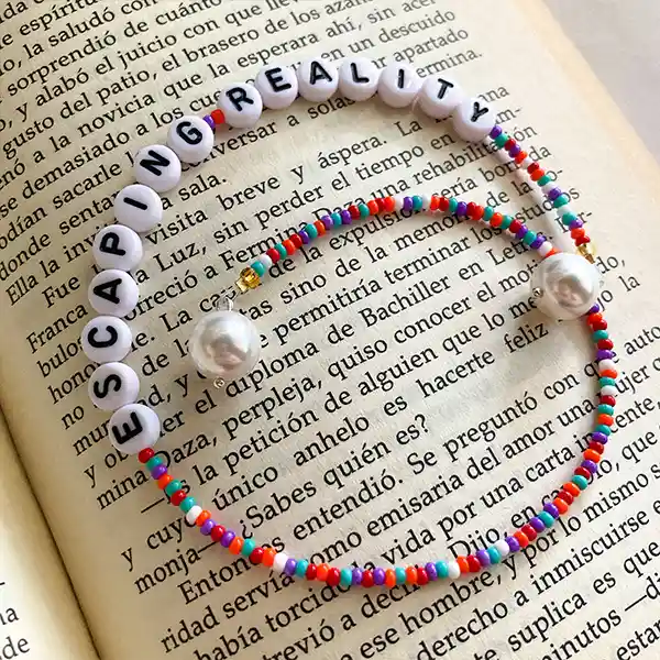 Separador de libros hecho en mostacillas y letras plásticas. Largo: 32.8 CM.