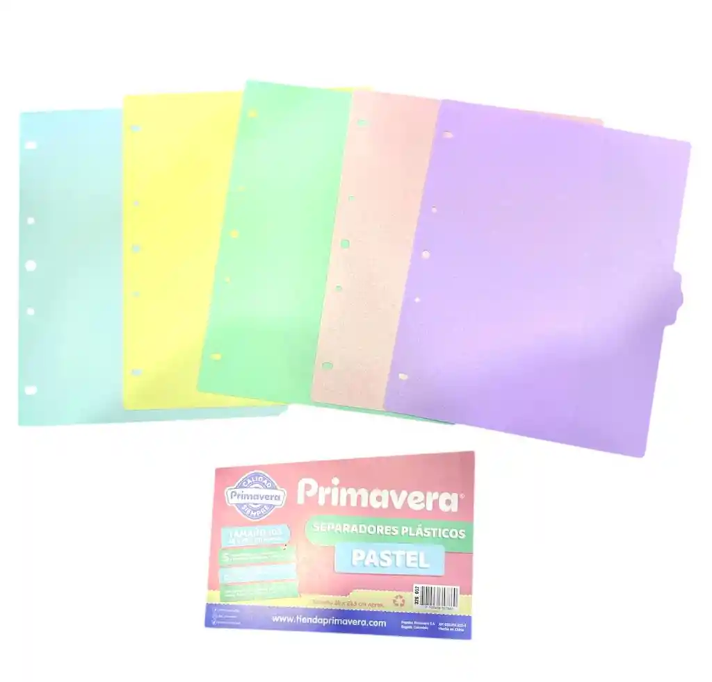 El separador de hojas y archivos esta hecho de Plastico de 5 colores pasteles colores surtidos, cuenta con 5 agujeros para folder y de tamaño 105 (28cm X 23,5cm). Sirven para dividir la información en grupo Organizar los folios en el momento de archivarlos te ayudará a encontrarlos después.