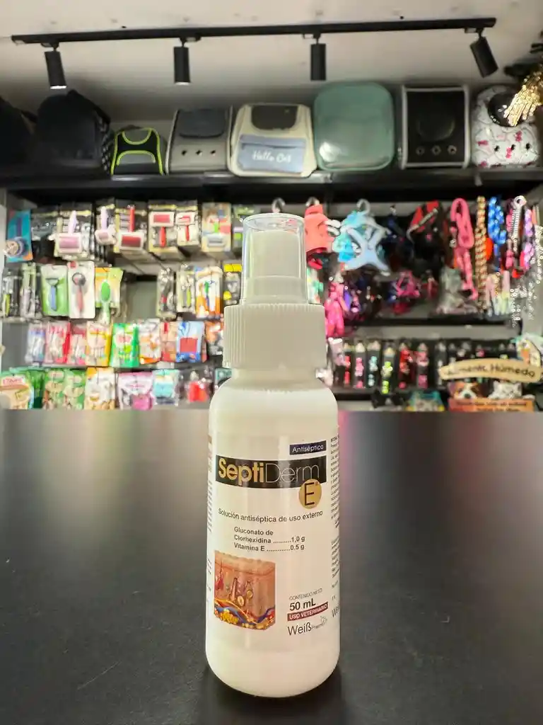 antiséptico tópico veterinario para perros, gatos y otros animales, formulado con clorhexidina (antiséptico y desinfectante) y vitamina E (antioxidante, antiinflamatorio y cicatrizante).