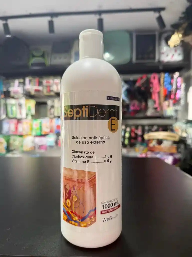 antiséptico tópico veterinario para perros, gatos y otros animales, formulado con clorhexidina (antiséptico y desinfectante) y vitamina E (antioxidante, antiinflamatorio y cicatrizante).