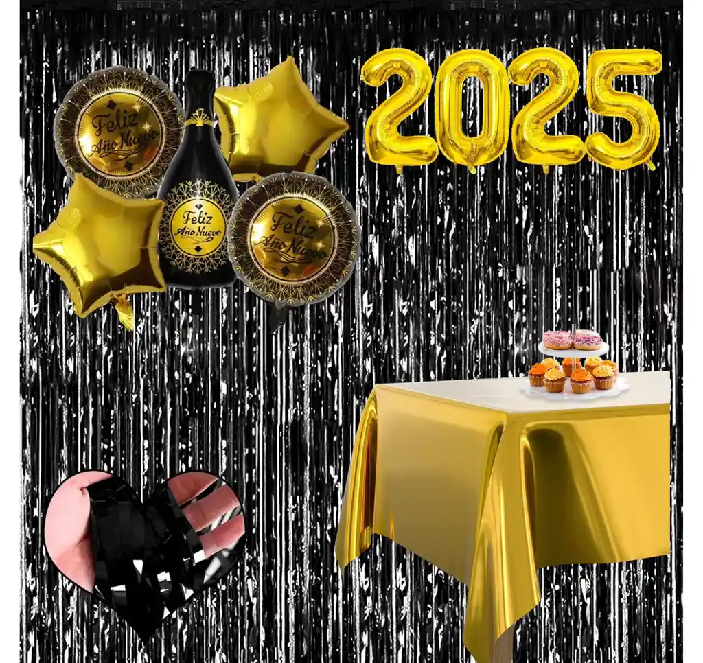 Fiesta dorada para feliz año negro incluye 2 cortinas metalizadas de color negro largo de 2 metros y ancho de 1 metro 1 mantel metalizado dorado buquet de 5 globos metalizados botella de champagne de 70 cm 2 estrellas de 45 cm y 2 globos redondos de 45 cm 4 globos de 2025 de 80 cm cada uno color dorado los globos se envían sin inflar si deseas algo adicional indícanos y te colaboramos