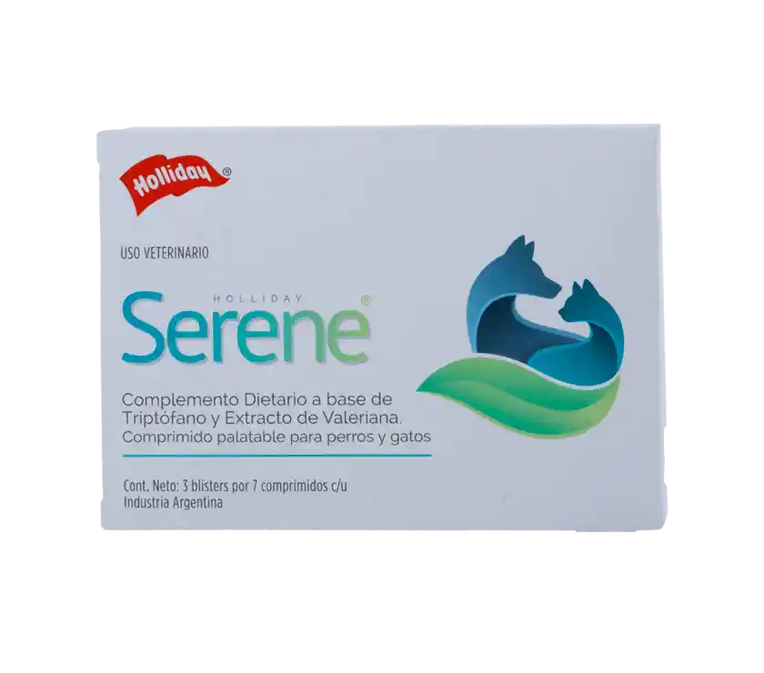 Serene es un suplemento dietario para perros y gatos que ayuda a modular la ansiedad en situaciones de estrés o miedo, como viajes, ruidos fuertes, mudanzas, separación, post-operatorios o cambios en el hogar. Su fórmula con triptófano favorece la producción de serotonina, contribuyendo a un comportamiento más equilibrado. Además, incluye valeriana como relajante natural para apoyar la calma sin alterar la rutina de tu mascota. - Ayuda a modular la ansiedad en situaciones de estrés o miedo - Apoya la calma con valeriana como relajante natural - Contribuye a disminuir conductas asociadas a ansiedad como inquietud o agresividad - Útil como apoyo en viajes, separación, cambios ambientales y post-operatorios