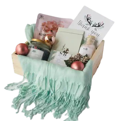 Pashmina, vela aromática 130gr, jabón de menta, espejo, Sales de baño de rosas, mascarilla facial de rosas, Caja de madera y tarjeta de navidad.
