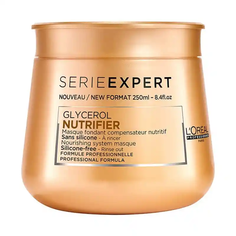 Mascarilla de textura ligera, indicada para los cabello secos y faltos de nutrición. Libre de siliconas y con sus dos ingredientes principales, el Glicerol, que potencia la nutrición e hidratación del cabello, y el Aceite de Coco, rico en ácidos esenciales que nutren la fibra capilar, aportando el cuerpo, la nutrición, e hidratación necesaria para lucir un cabello brillante y suave, sin sobrecargarlo, lo que la hace apta tanto para cabello fino como grueso. Además previene las puntas abiertas y la rotura del cabello. Tu pelo quedará transformado al instante: suave, manejable, brillante, y saludable. Modo de Empleo Aplicar sobre el cabello lavado y secado con toalla, masajear ligeramente, dejar actuar el producto de tres a cinco minutos, y aclarar bien. Repetir si fuera necesario. Instrucciones detalladas en el envase. Nutrifier Serie Expert L'Oreal Professionnel Completísima línea de productos libres de siliconas, creada para resolver los problemas del cabello seco. Con sus dos ingredientes principales, el Glicerol, que potencia la nutrición e hidratación del cabello, y el Aceite de Coco, rico en ácidos esenciales que nutren la fibra capilar, el cabello queda saludable, suave, y brillante al instante.