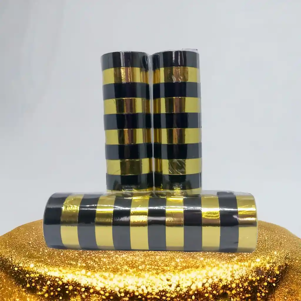 ●Pack de 3 Tubitos ●Serpentinas. Metalizadas Color Dorado)Negro de 4m ●Cada tubo trae 12 aritos