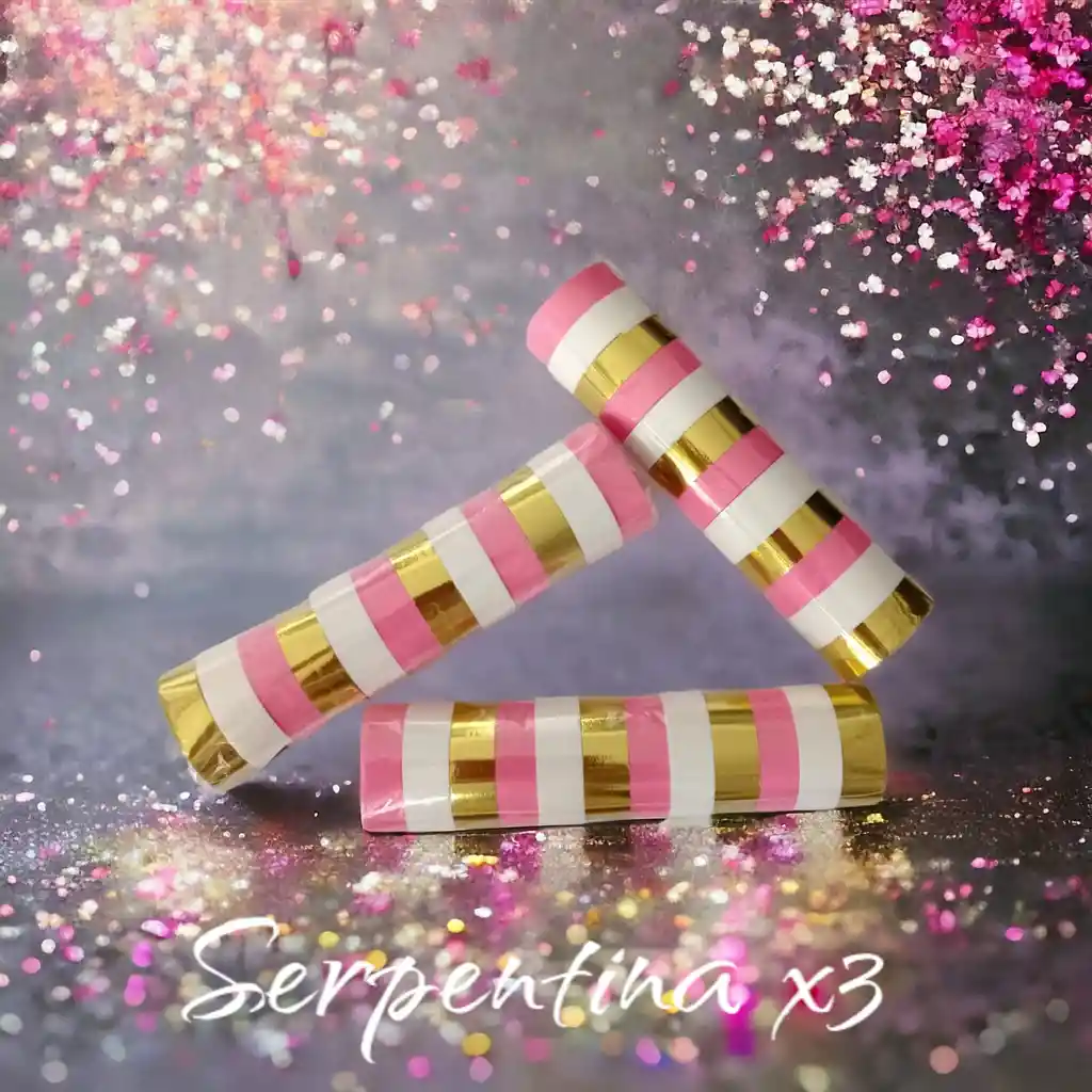 ●Pack de 3 Tubitos Serpentinas Metalizadas ●Color: Dorado~Rosado~ Blanco de 4m ●Cada tubo trae 12 aritos