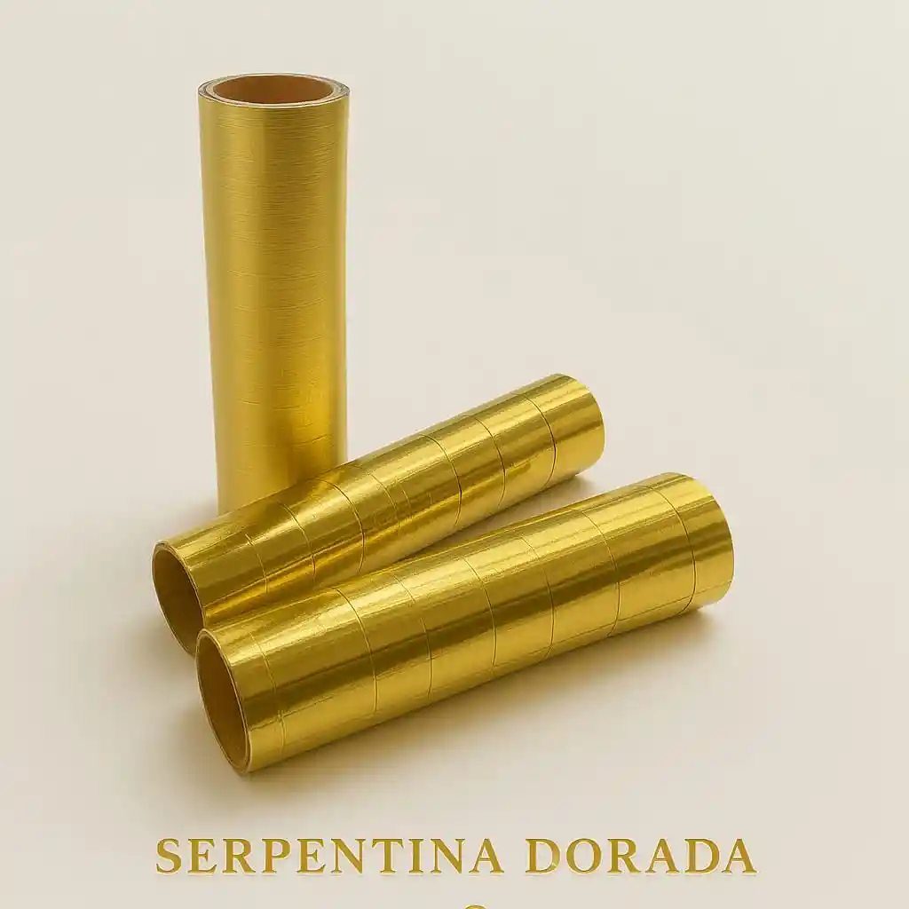 Serpentina Metalizada X3 Unidades Color Dorado ●Pack de 3 Tubitos ●Serpentinas Metalizadas en Color, Dorado de 4m ●Cada tubo trae 12 aritos
