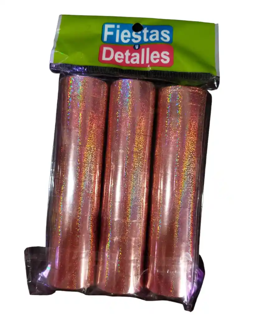 Serpentina Oro rosa brillante Temas y Ocasiones: Adultos y casual Color: Oro Rosa Brillante Medidas: 4 mts Material: Papel film , 100% Polyester Cantidad: un paquete con 3 rollos