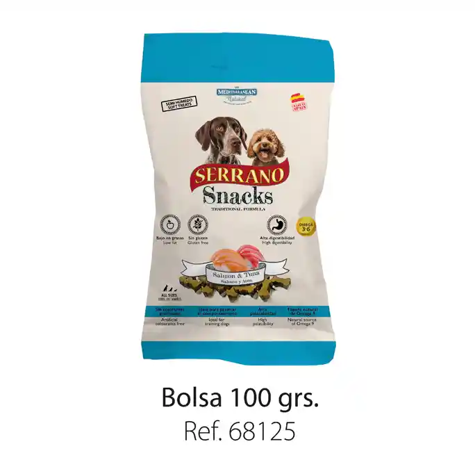Los Serrano Snacks de MEDITERRANEAN NATURAL, delicadamente cortados en pequeñas cantidades con forma de huesito, garantizan la seguridad de la mascota, mantienen su pureza y todos los nutrientes, reflejan la dieta natural y contienen al menos 70 % de carne (69% en “Serrano Snacks for puppies”). Elaborados con materias primas exentas de gluten, no contienen colorantes artificiales, transgénicos ni ácidos grasos trans. Los Serrano Snacks de salmón y atún aportan Omega 3 y 6. Son el snack perfecto para premiar el comportamiento de su mascota. Ideales en el adiestramiento.