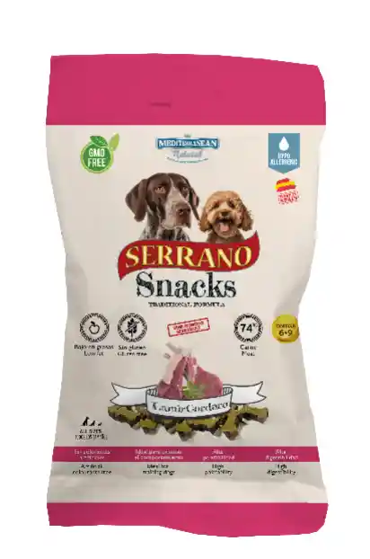 Los Serrano Snacks de MEDITERRANEAN NATURAL, delicadamente cortados en pequeñas cantidades con forma de huesito, garantizan la seguridad de la mascota, mantienen su pureza y todos los nutrientes, reflejan la dieta natural y contienen al menos 70 % de carne (69% en “Serrano Snacks for puppies”). Elaborados con materias primas exentas de gluten, no contienen colorantes artificiales, transgénicos ni ácidos grasos trans. Los Serrano Snacks de salmón y atún aportan Omega 3 y 6. Son el snack perfecto para premiar el comportamiento de su mascota. Ideales en el adiestramiento. Con 70% de carne Con arroz