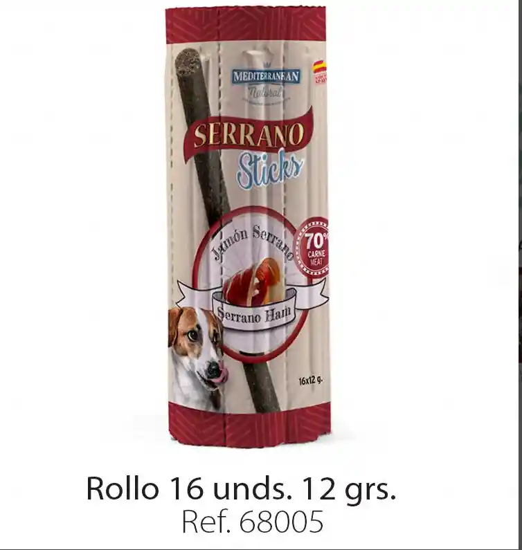Son unas barritas que se presentan envasadas individualmente al vacío en rollitos de 16 unidades. Su punteado permite rasgar y separar cuantas barritas se desee y su abrefácil lo hace el snack ideal para llevar en el paseo diario, en vacaciones o en las escapadas y salidas al campo. Preparadas con materias primas exentas de gluten, no contienen colorantes artificiales. Las Serrano Sticks de salmón y atún aportan Omega 3 y 6. Blanditas y muy atractivas para el perro,