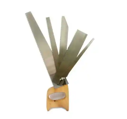 Mango de madera • 5 hojas intercambiables • Hojas de acero • Medidas de hojas en (cm) 35.5 x 6.5/26 x 5/30 x 3/30 x 2.5/25 x 2 • Dientes x pulgada: Varían de 8 a 12 • Ideal para uso de tareas hogareñas o hobbies