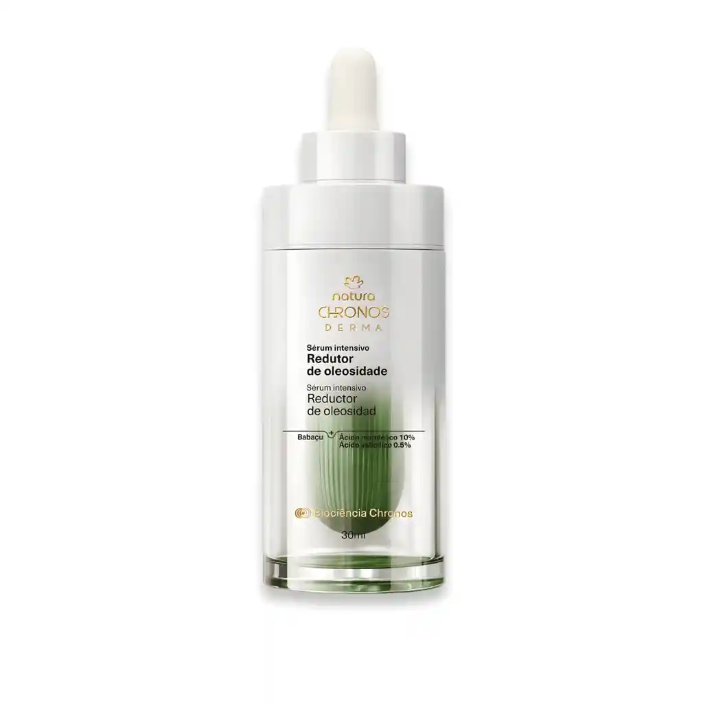 Sérum Facial Natura Chronos Reductor de Oleosidad 30 ml | Control y equilibrio Descripción del producto El Sérum Intensivo Reductor de Oleosidad Natura Chronos 30 ml está formulado para controlar el exceso de brillo, ayudar a regular la producción de sebo y mejorar la apariencia de los poros. Su textura ligera de rápida absorción brinda un acabado más mate, uniforme y confortable, ideal para el cuidado diario de la piel. Atributos destacados Control de oleosidad, ayuda a reducir el brillo excesivo. Textura ligera y de rápida absorción, sin sensación pesada. Mejora la apariencia de los poros, dejando la piel más uniforme. Acabado mate y confortable, ideal para el día a día. Presentación de 30 ml, concentrada y rendidora. Línea Chronos de Natura, enfoque dermocosmético. Experiencia de uso Desde las primeras aplicaciones, la piel se siente más equilibrada y fresca, con una reducción visible del brillo. Con el uso continuo, el rostro luce más uniforme y saludable, preparado para el maquillaje o para lucir al natural. Recomendado para Personas con piel mixta a grasa que buscan un tratamiento intensivo para controlar la oleosidad y mejorar la textura de la piel dentro de su rutina facial. Modo de uso Aplicar unas gotas sobre el rostro limpio y seco, preferiblemente en la mañana y noche. Distribuir con suaves movimientos hasta su completa absorción. Puede usarse antes de la crema hidratante. Conservación Mantener en un lugar fresco y seco, protegido del calor y la luz directa. Cerrar bien el envase después de cada uso. Por qué te encantará Porque ofrece control de oleosidad, textura ligera y resultados visibles, ayudando a mantener la piel equilibrada, fresca y con apariencia saludable todos los días.