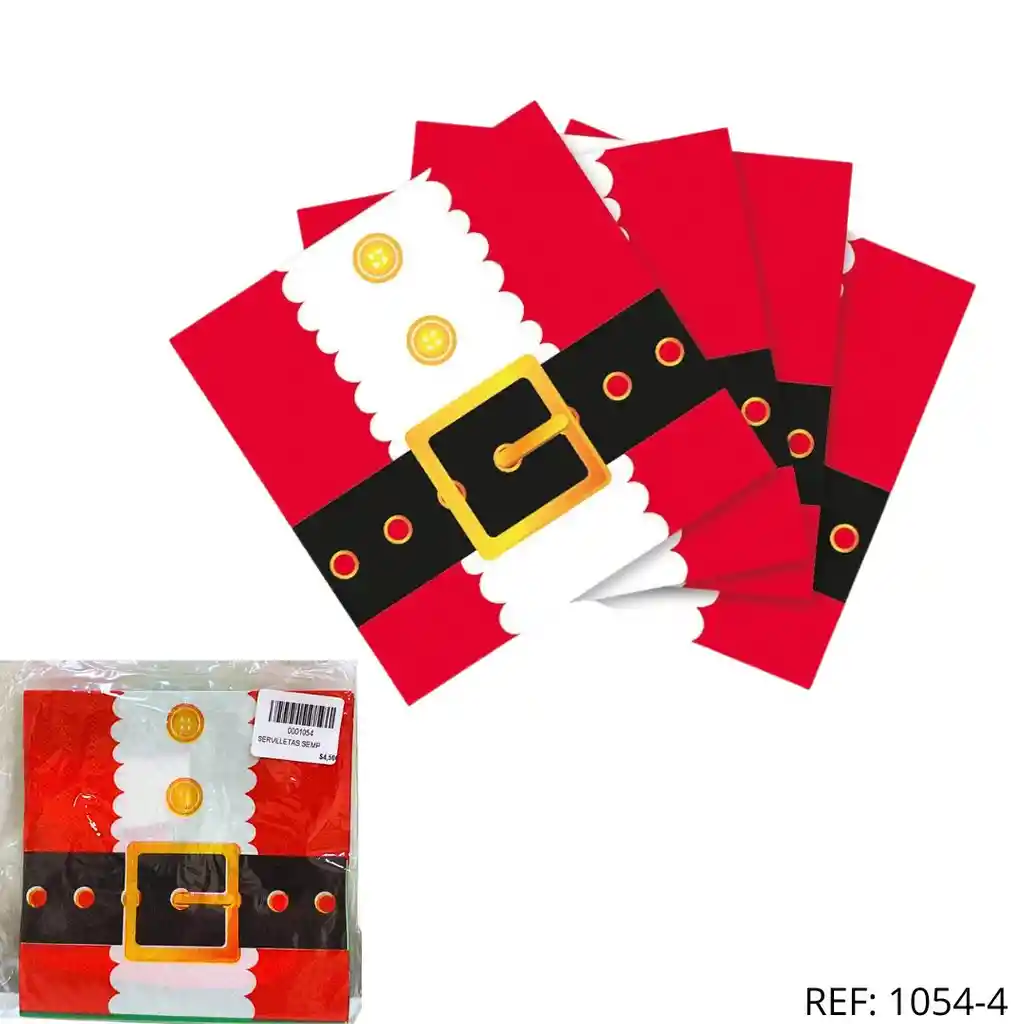 Servilletas temáticas con diseño del traje de Santa Claus, ideales para decorar mesas en cenas, fiestas y celebraciones navideñas. Aportan un toque festivo, colorido y elegante a cualquier evento. Prácticas y decorativas para compartir momentos especiales en Navidad. PAQUETE X16UND
