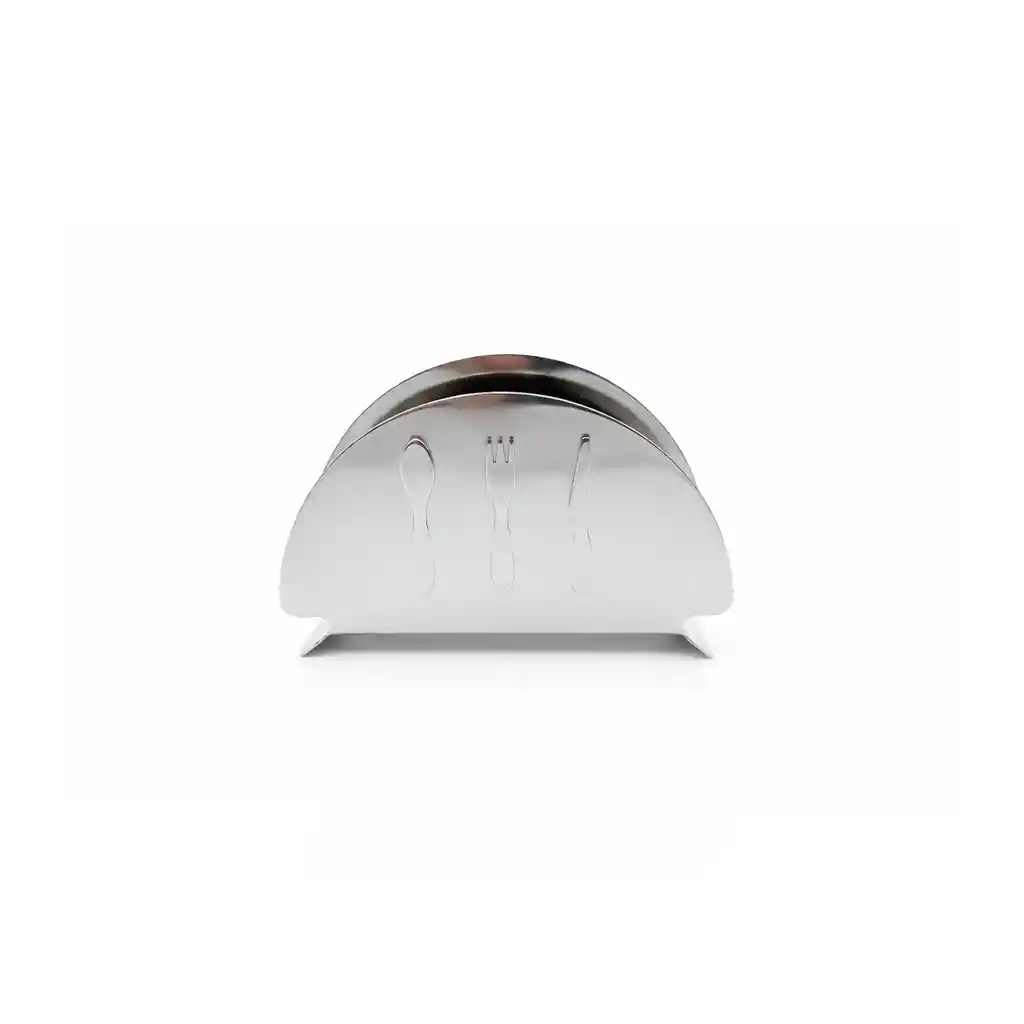 Elaborada en acero inoxidable. Terminacion brillante. Incluye grabados decorativos de cubiertos. Forma semicircular con base estable. Ideal para lavar en lavavajillas. Resistencia a la corrosión y al desgaste. Apto para uso diario. Ligero y práctico de ubicar. Diseño compacto y funcional. Material higiénico y reutilizable. Mantiene las servilletas organizadas. Perfecto para cocina y comedor. Fácil limpieza y mantenimiento. La imagen ha sido ambientada; no incluye accesorios adicionales y el color puede variar según la iluminación.