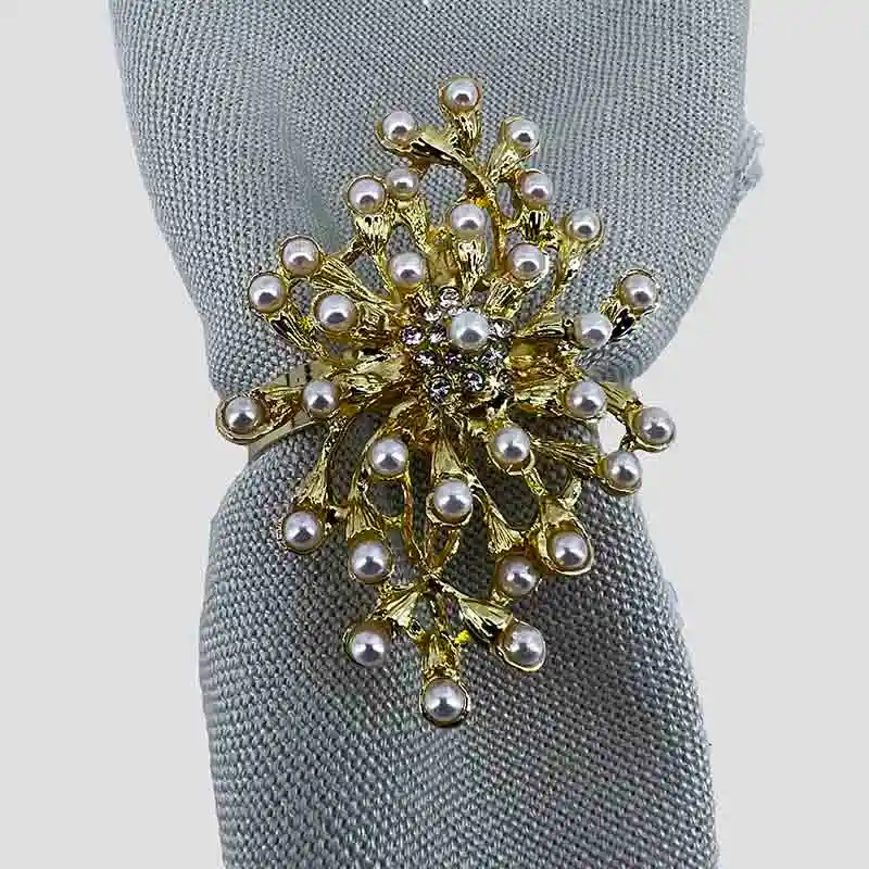 SERVILLETERO CON DISEÑO DE ROMBO DORADO DECORADO CON PERLAS Y PIEDRAS PLATEADAS. EL DIÁMETRO DEL ARO ES DE 4.5CM Y EL TAMAÑO DE LA FIGURA ES DE 8X5CM. EL PAQUETE VIENE X4 UNIDADES.