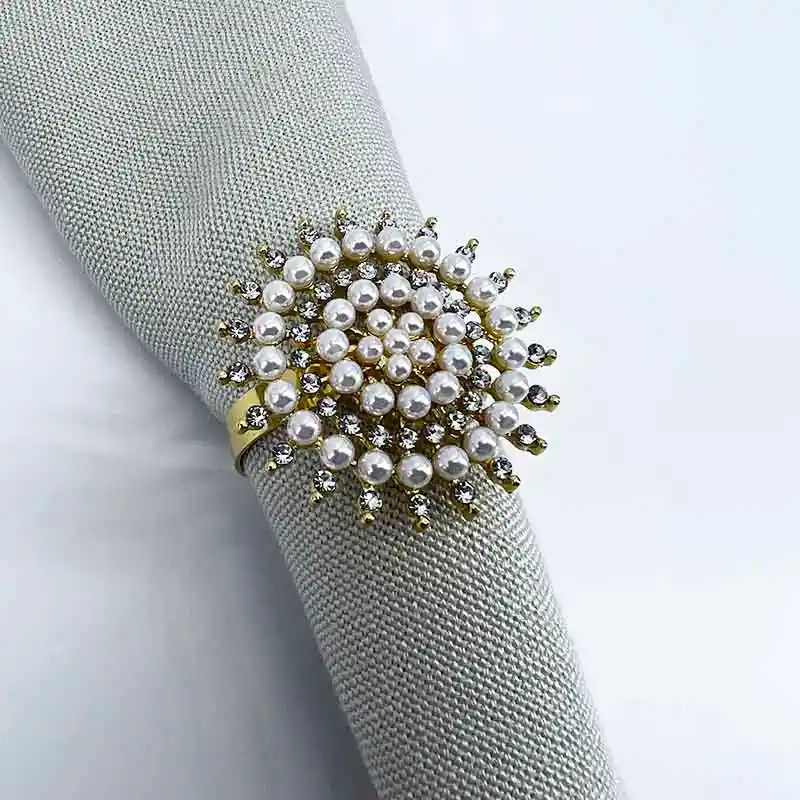 SERVILLETERO REDONDO CON DISEÑO DE PERLAS Y PIEDRAS DORADAS. EL DIÁMETRO DEL ARO ES DE 4.5CM Y EL TAMAÑO DE LA FIGURA ES DE 5.5CM. EL PAQUETE VIENE X4 UNIDADES.