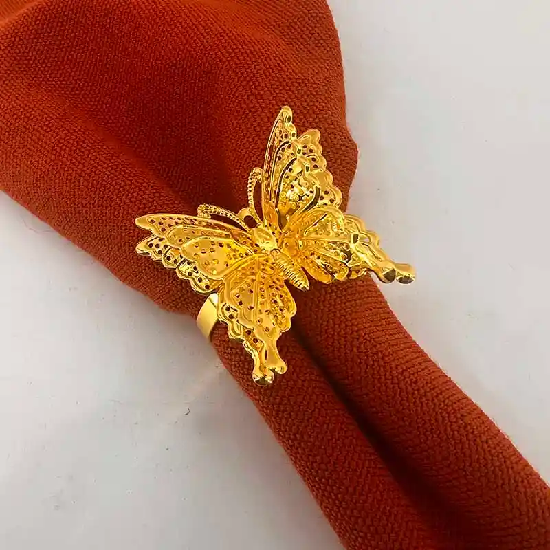 CAJA DE SERVILLETEROS X 4 UNIDADES. ES UNA MARIPOSA TALLADA EN COLOR DORADO. CADA MARIPOSA TIENE UNA MEDIDA DE 4 CM Y EL ARO TIENE UN DIAMETRO DE 4.5CM. VIENEN EMPACADOS EN CAJA DE ACETATO TRANSPARENTE.