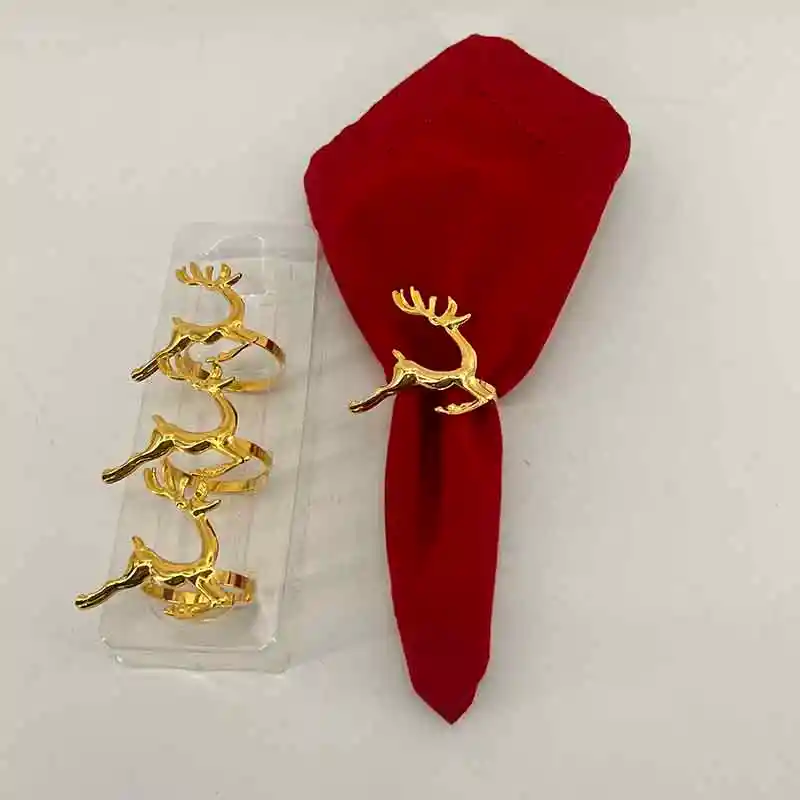 CAJA DE SERVILLETEROS X4 UNIDADES. DISEÑO DE VENADO DORADO. EL VENADO CUENTA CON UNA MEDIDA 6CM Y EL ARO DEL SERVILLETERO DE 4.5 CM DE DIAMETRO. VIENEN EMPACADOS EN CAJA DE ACETATO TRANSPARENTE.