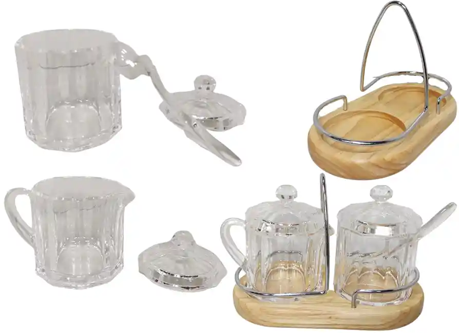 Somos Inversiones MAZUGI SET 2 CONDIMENTEROS CON BASE Y 1 CUCHARA Hecho de policarbonato Uno sirve para condimentos como sal o azúcar y el otro para líquidos Incluye base de madera Medidas Alto: 10cm Largo: 11cm Ancho: 7cm Presentación en caja