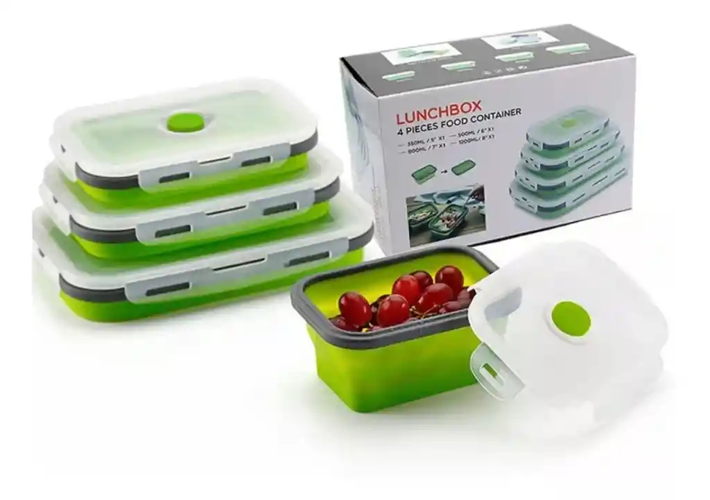 Set 4 Loncheras plegables de goma de silicona Fiambrera de comida 100% nuevo y de alta calidad Material: Silicona Calidad Alimentaria Color: rojo, verde, azul Característica: respetuoso del medio ambiente Forma: rectángulo Uso: Cocina Tamaño: S-13.1cm × 9,6 cm x 3cm M-16.5cm × 11cm x 3cm L-18.5cm × 12cm x 3cm El paquete incluye: 4 × fiambrera de silicona