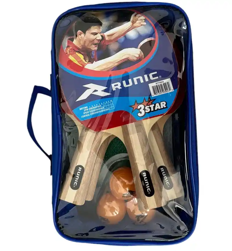 SET 4 RAQUETAS TENIS MESA RUNIC - RTT923/ Azul Las raquetas de tenis de mesa Runic RTT923 están diseñadas para ofrecer un rendimiento óptimo en partidas recreativas y de nivel intermedio. Cada raqueta cuenta con una construcción de alta calidad. las raquetas Runic RTT923 sean ideales para jugadores que buscan mejorar su juego y disfrutar de una experiencia de ping pong satisfactoria. CARACTERÍSTICAS: - Las raquetas de tenis de mesa Runic RTT923 están diseñadas para ofrecer un rendimiento óptimo en partidas recreativas y de nivel intermedio. Cada raqueta cuenta con una construcción de alta calidad que incluye: - Espesor de esponja y caucho de alta calidad: Proporciona un buen control y velocidad en el juego. - Construcción de 7 capas: Combinación de 5 capas de madera de primera calidad y 2 capas de fibra de carbono, lo que mejora la durabilidad y la respuesta de la raqueta. DISTRIBUIDOR AUTORIZADO Envíos a nivel nacional ONE ZONE SPORT NIT: 901.451.888-6